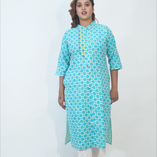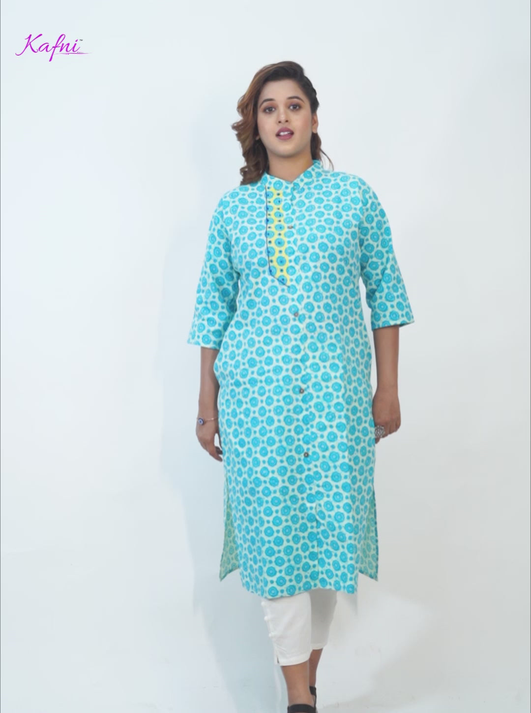 Step into effortless elegance with our Aqua Blue Handblock Print Cotton Kurti. Crafted from breathable premium cotton, this kurti features a sophisticated floral print, mandarin collar, and wooden buttons for a perfect blend of tradition and modern style. Ideal for both casual outings and office wear.