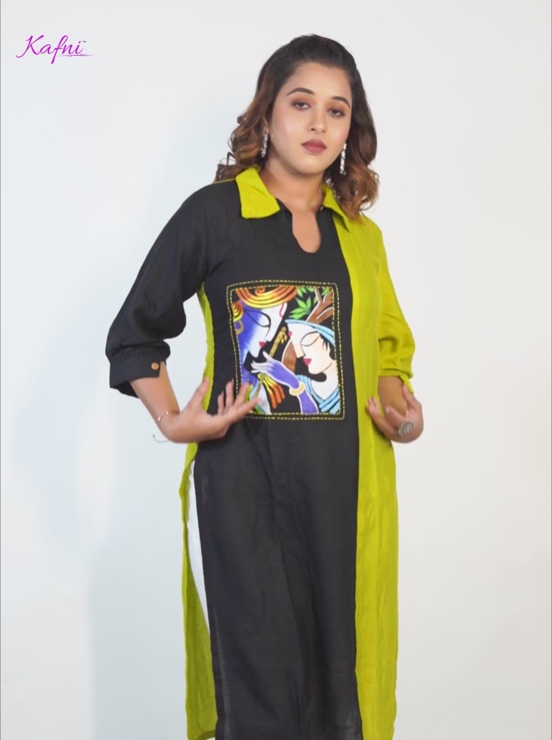 Turn heads with this vibrant fusion-style kurti, crafted from premium linen fabric. Featuring bold hand-printed artwork and detailed hand embroidery, it adds a touch of modern art to traditional elegance.