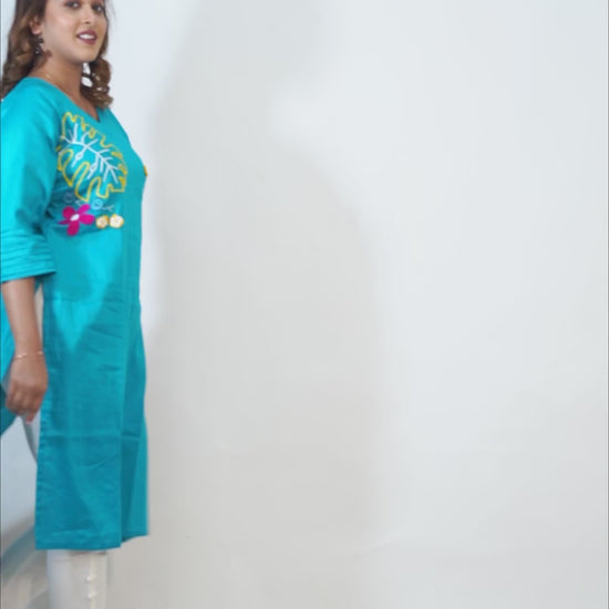 Crafted in rich Malai Cotton with a linen-like finish, this kurti features exquisite hand embroidery for a luxurious yet breathable wear. Perfect for elevating everyday elegance with an artisanal touch.