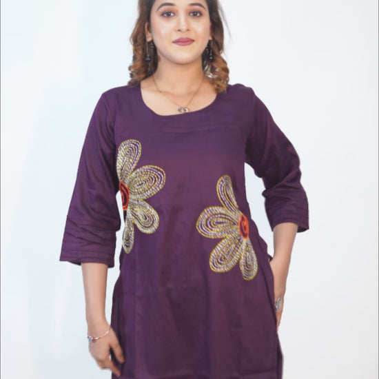 Crafted from premium Malai Cotton, this deep plum straight kurti showcases detailed hand embroidery in artistic floral motifs. It blends everyday comfort with elevated ethnic sophistication, perfect for both casual and festive wear.